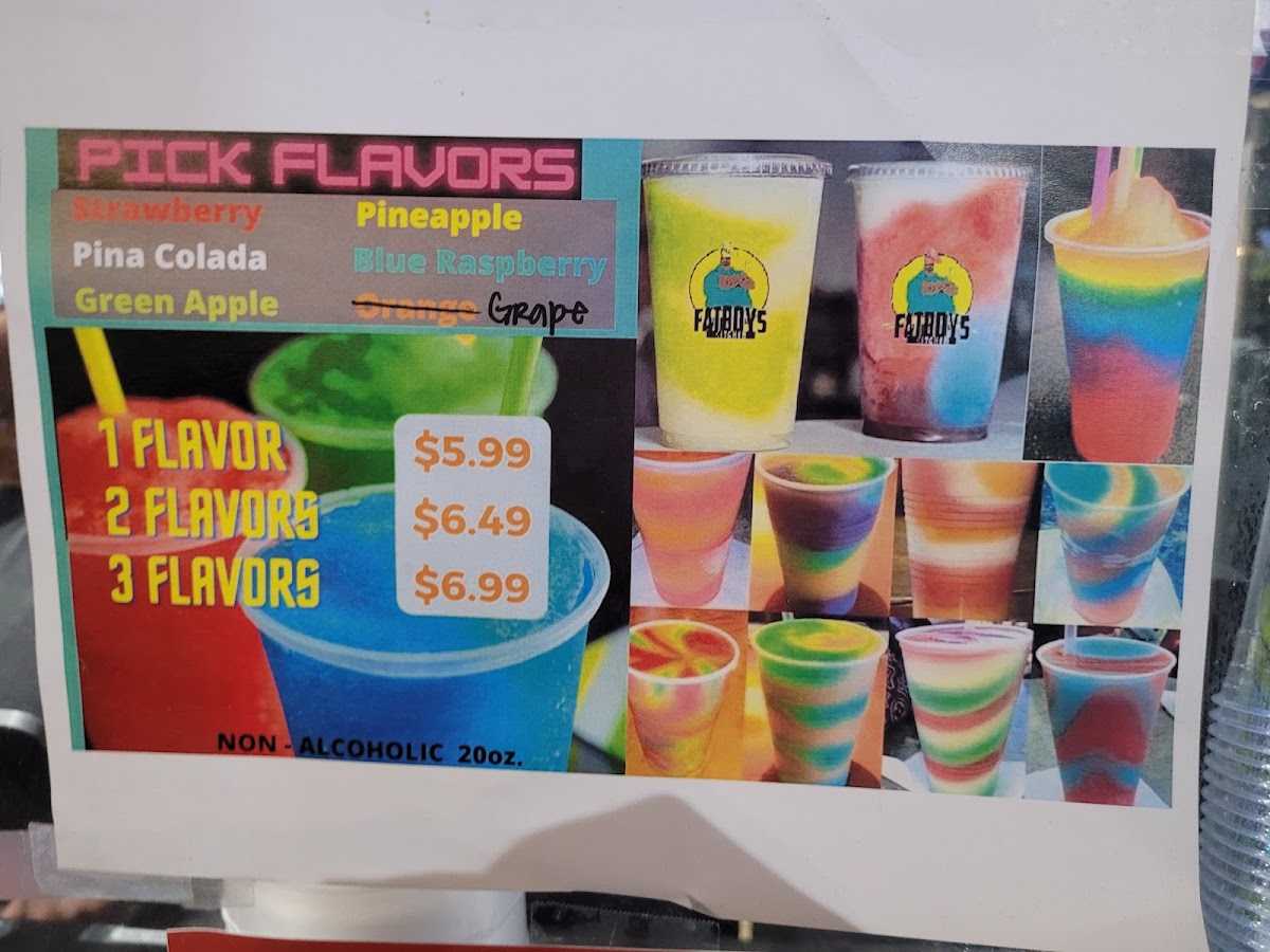 Flavors: regular, FatBoys blue, mango, peach, strawberry, lavender butterfly pea.
